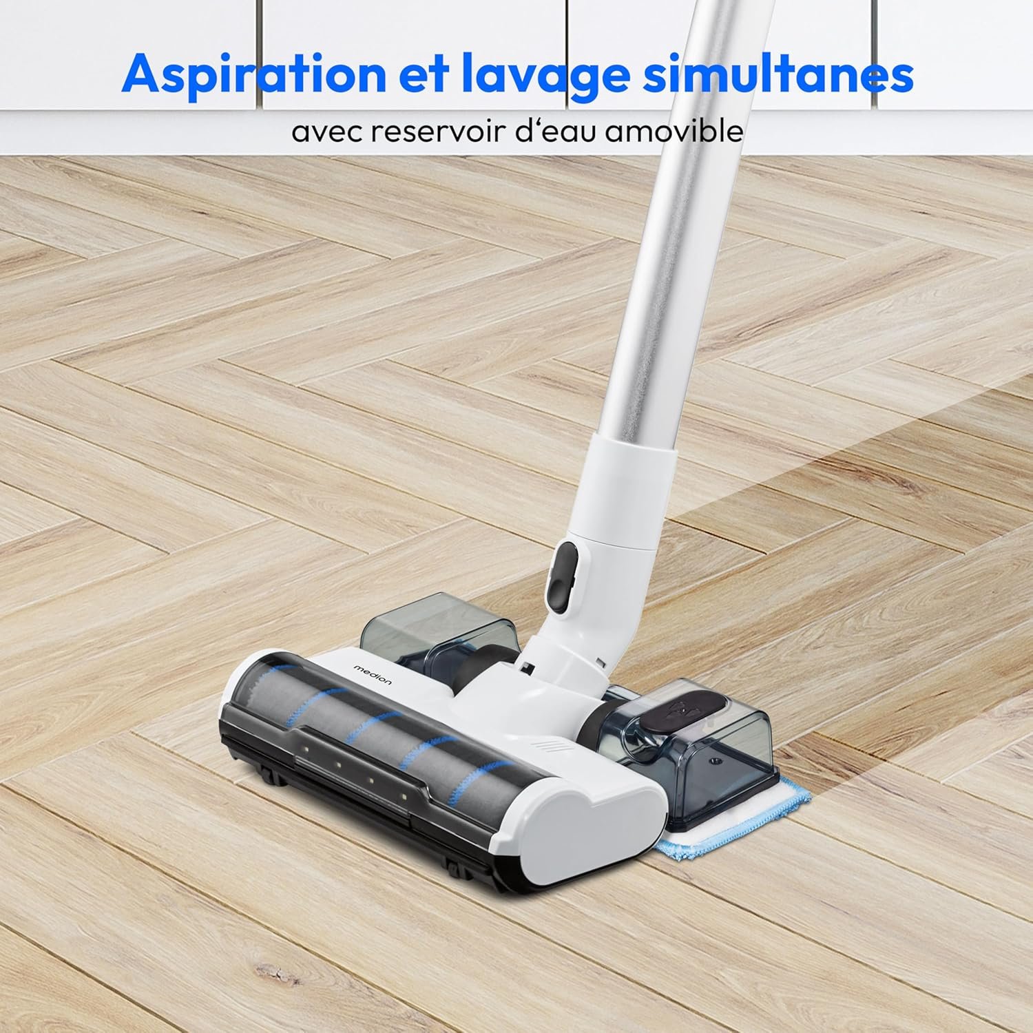 MEDION P400 W- Aspirateur balai sans fil 2-en-1 avec fonction lavage, bonne puissance d’aspiration mode élevé.