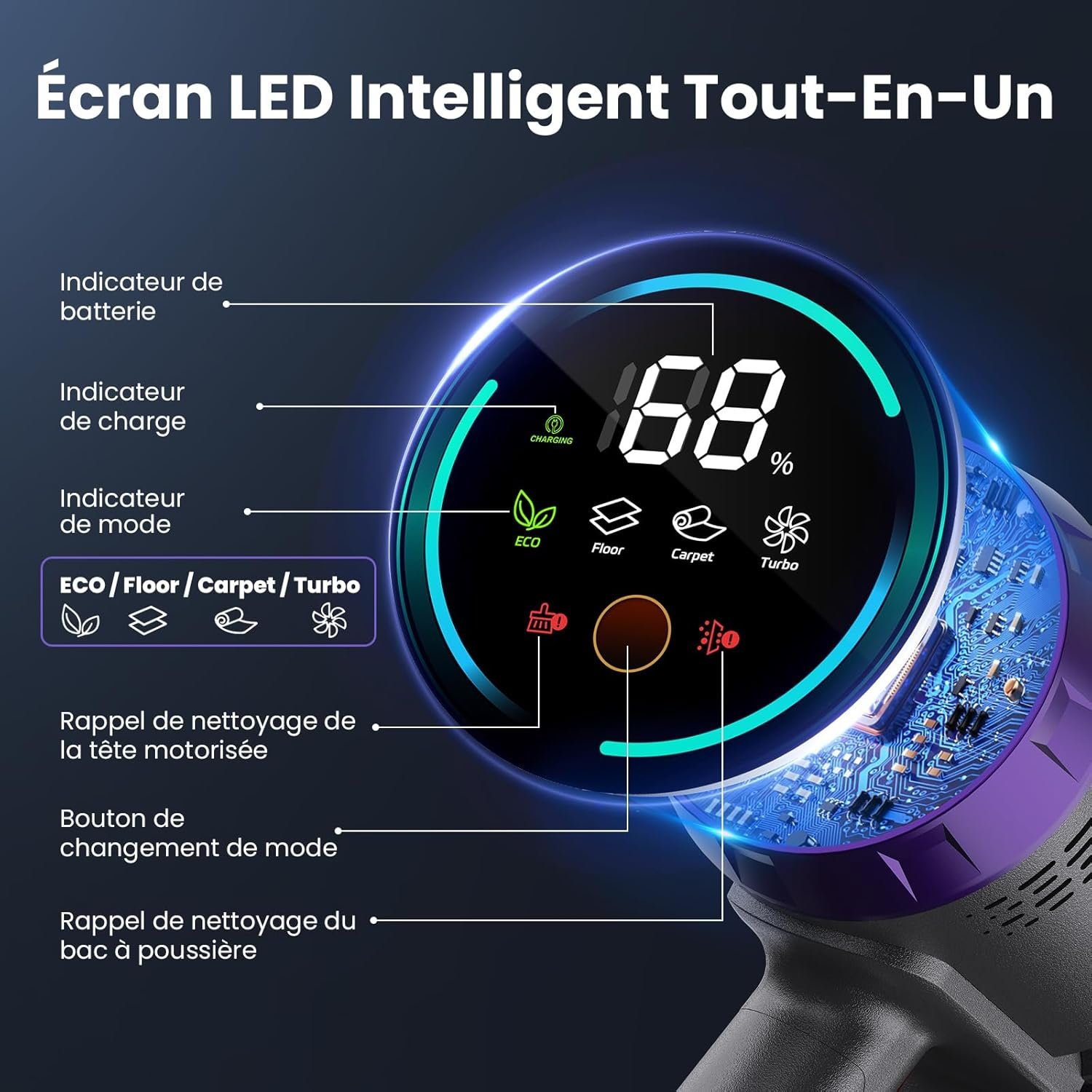 ① Moteur sans balais de 600 W ② Puissante aspiration de 58 kpa ③ Mode automatique avec une autonomie allant jusqu'à 75 minutes ④ Réservoir à poussière de grande capacité de 1,6 L ⑤ Batteries amovibles de 8 x 3200 mAh __PLACEHOLDER_BRAND_16__ Filtration efficace à 99,99 % Ecran LED tactile intelligent avec rappel de nettoyage de la brosse motorisée et du Réservoir à poussière Brosse en forme de V anti-enchevêtrement. Support mural pour le chargement et le stockage. Service client fiable