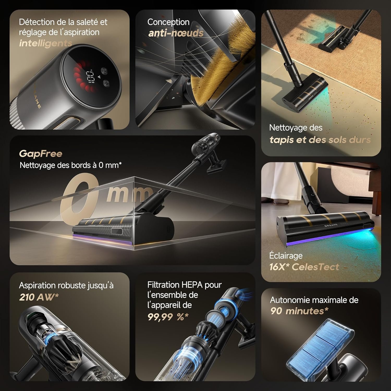 Les données avancées par la marque suffisent à situer l’appareil : 210 AW d’aspiration annoncés, jusqu’à 90 minutes d’autonomie, brosse anti-enchevêtrement, base de charge au sol et bac de 0,5 L. Ces chiffres traduisent surtout une ambition de milieu/haut de gamme, pas une garantie automatique d’excellence dans tous les cas.