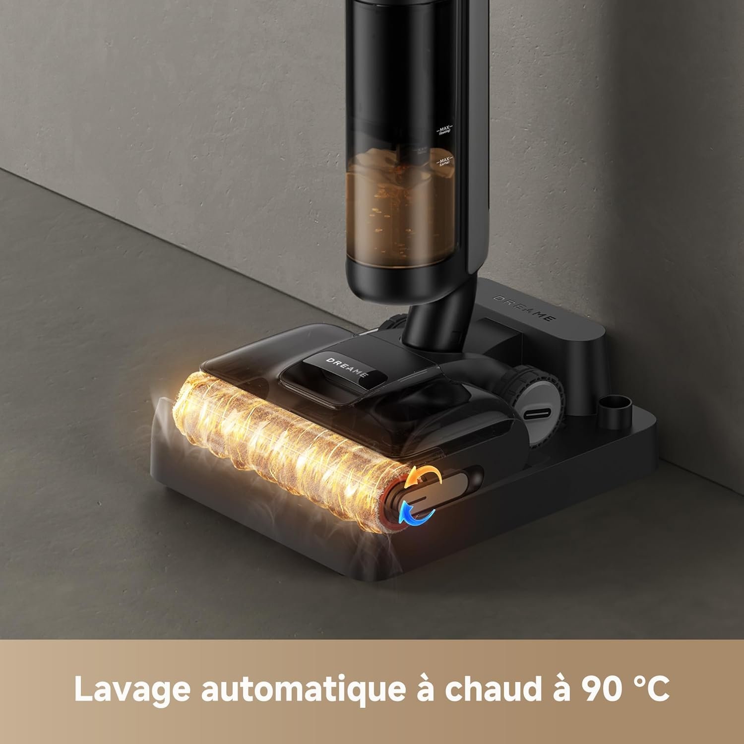 Avec 18 000 Pa annoncés, un lavage à chaud à 90 °C, une brosse alimentée en eau propre en continu, puis un auto-nettoyage avec séchage à air chaud à 90 °C, ce modèle met clairement l’accent sur le nettoyage humide. Sur carrelage, parquet vitrifié ou lino, c’est le terrain naturel de ce type d’appareil.