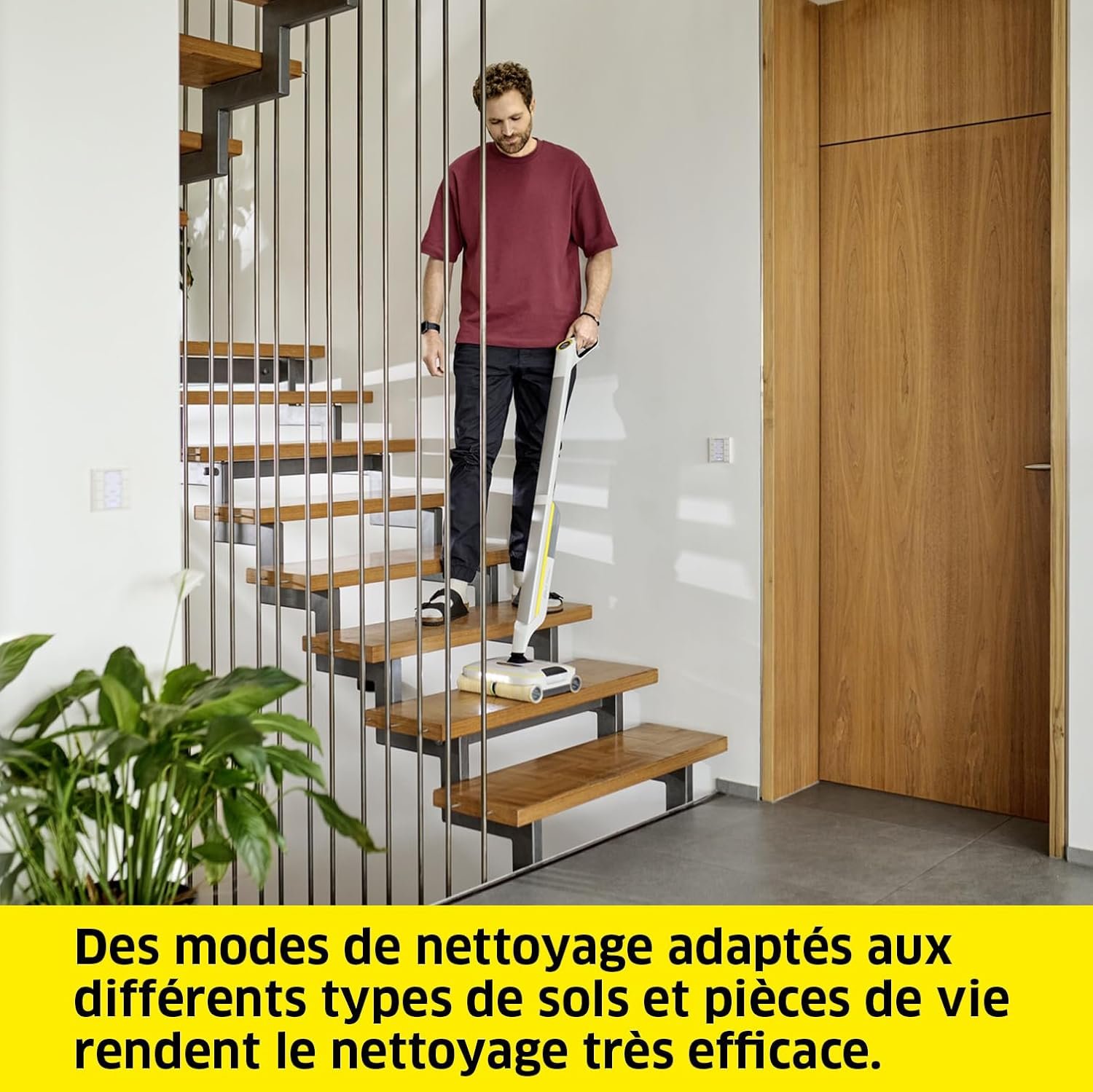 Pour ceux qui préfèrent une approche mixte, l'aspirateur sans fil Kärcher FCV combine aspiration et lavage dans un format plus polyvalent.