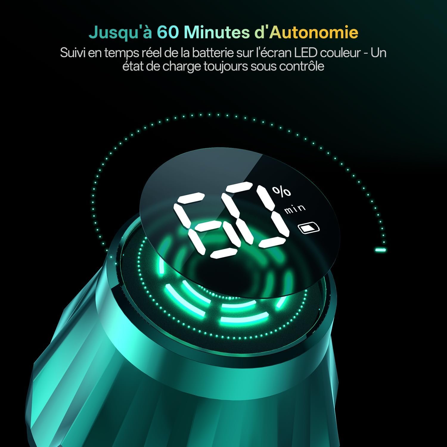 La batterie est amovible, ce qui est un point notable dans cette gamme de prix. Cela ouvre la possibilité d’acheter une batterie supplémentaire pour doubler l’autonomie, et surtout, cela facilite un remplacement futur sans devoir changer l’appareil entier. L’écran LED affiche le niveau de batterie restant en temps réel, un détail de confort appréciable pour anticiper la fin de charge en cours de ménage.